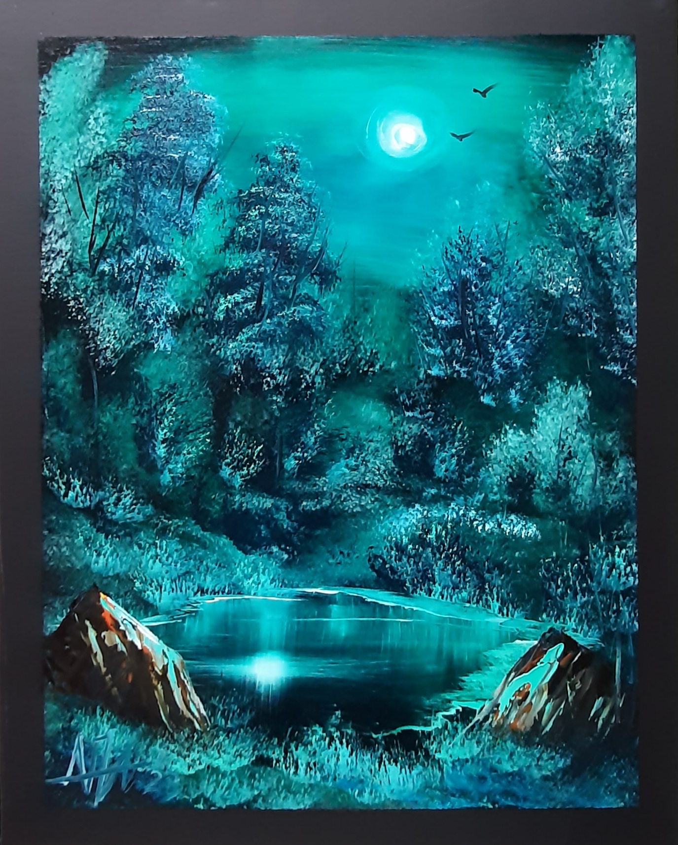 Dieses Bild entführt uns an einen ruhigen See der im Mondlicht badet. Mitten im nächtlichen Wald, eingerahmt von Felsen und Büschen schimmert der Mond im Wasser. Eine Szene wie aus einem Märchenbuch.