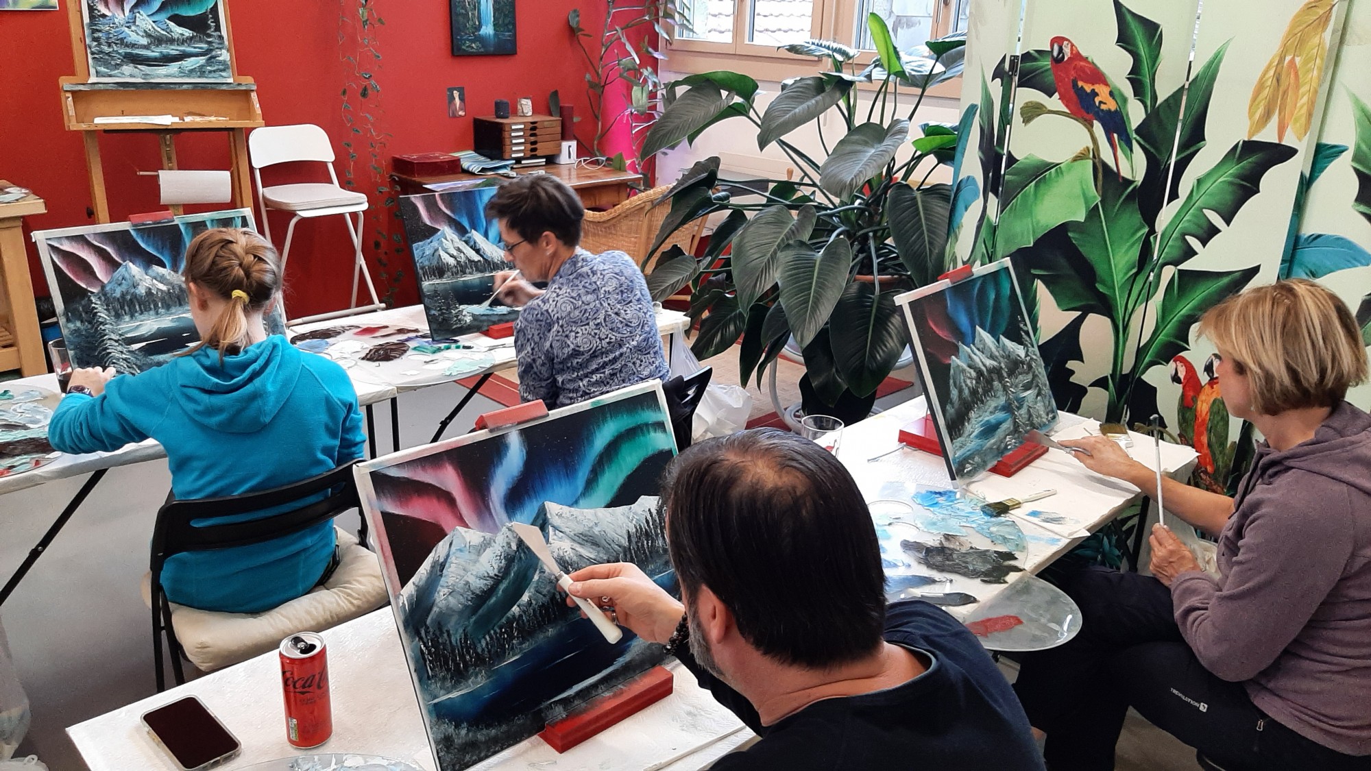28.11.2022 Ein toller Malkurs liegt hinter uns! Eine ruhige, konzentrierte Gruppe hat diese bunte Himmelserscheinung auf Leinwand gebannt. Die Hälfte der Teilnehmer hatte noch nie mit Ölfarbe gemalt, alle haben aber ein fantastisches Bild mit nach Hause genommen. Bravo!Der nächste Kurs führt uns dann weg vom Himmel auf den Grund eines Tals. Dichtes Grün umrahmt einen munteren Bach der sich durch dunkle Felsen schlängelt. Dieser Kurs heisst "Country Creek" und findet im Neuen Jahr Mitte Januar statt.