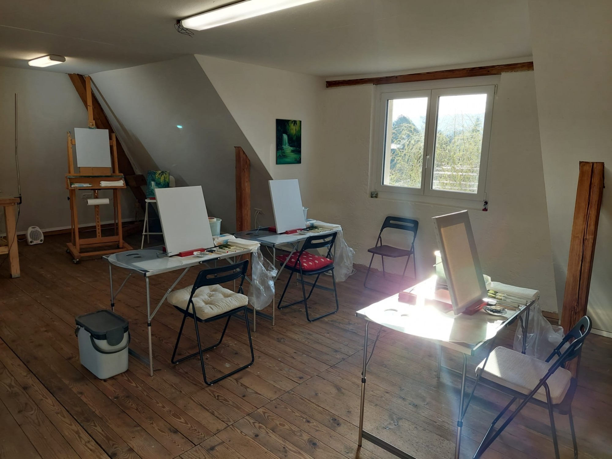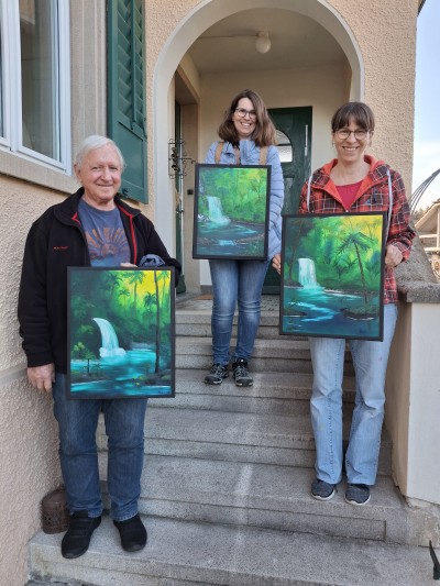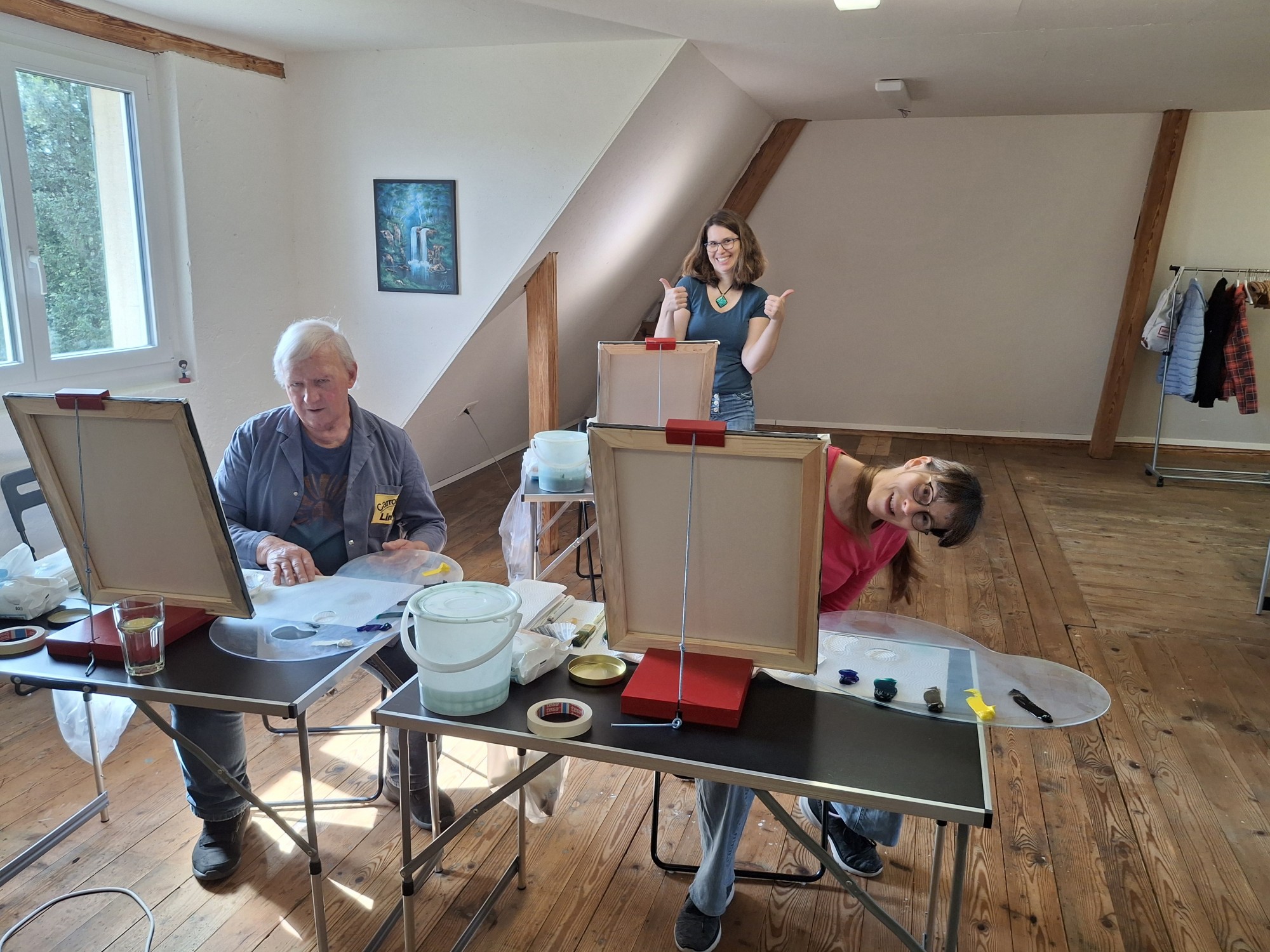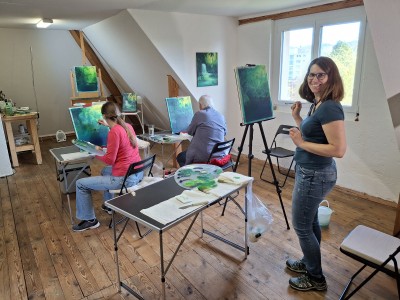 23.03.2025 Der Einstand ist geglückt! Das bestätigen sicher auch die fröhlichen Maler die "Exotic Rainforest" mit viel Elan auf die Leinwand gebracht haben.Im strahlenden Sonnenschein fand der erste Malkurs im brandneuen Atelier Karmin statt. Der Dachstock ist ausgebaut, frisch und hell gestrichen, damit man die wunderbaren Kreationen die hier entstehen werden, auch gut sehen kann. Der Boden ist frisch geölt, die Kaffemaschine läuft, alles bereit für viele weitere Kurse! Die Feuertaufe ist geglückt, auf ein Neues ganz bald.